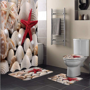 Setul pentru baie este completat de o perdea de duș, covorașe pentru podea și o husă pentru toaletă, oferind o soluție practică și elegantă pentru amenajarea băii dvs.